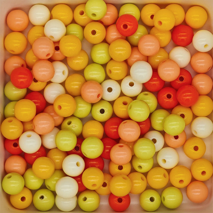 Smooth acrylic beads are packaged in an assorted variety of different colors. Lightweight beads are colorfast.