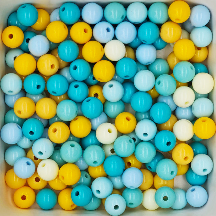 Smooth acrylic beads are packaged in an assorted variety of different colors. Lightweight beads are colorfast.
