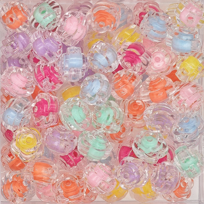 Smooth acrylic beads are packaged in an assorted variety of different colors. Lightweight beads are colorfast.