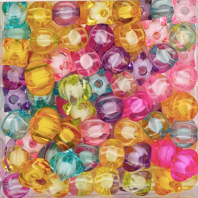 Smooth acrylic beads are packaged in an assorted variety of different colors. Lightweight beads are colorfast.