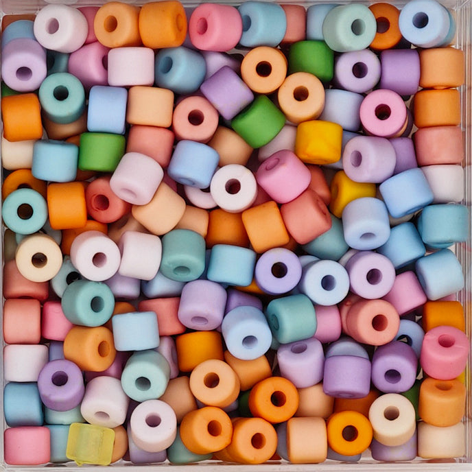 Smooth acrylic beads are packaged in an assorted variety of different colors. Lightweight beads are colorfast.