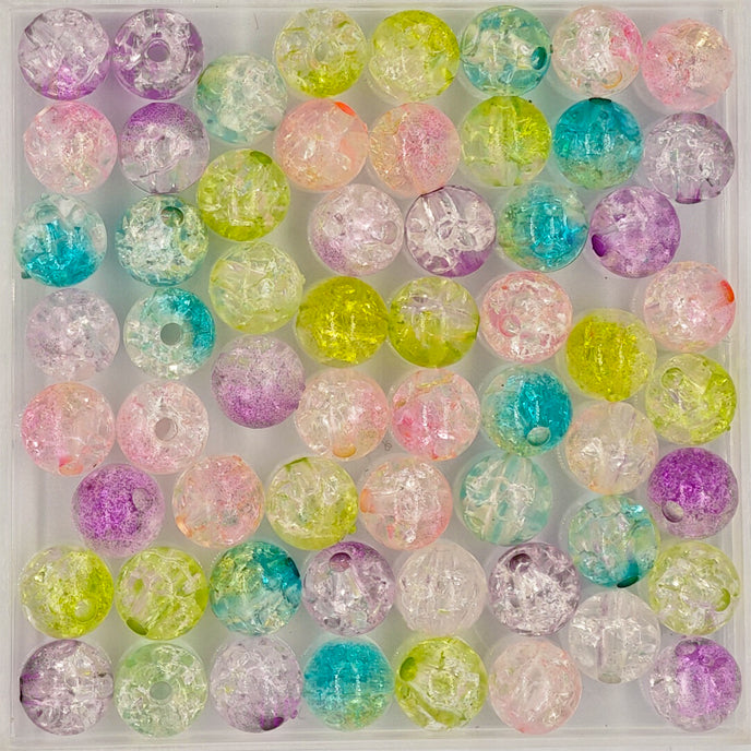 Smooth acrylic beads are packaged in an assorted variety of different colors. Lightweight beads are colorfast.