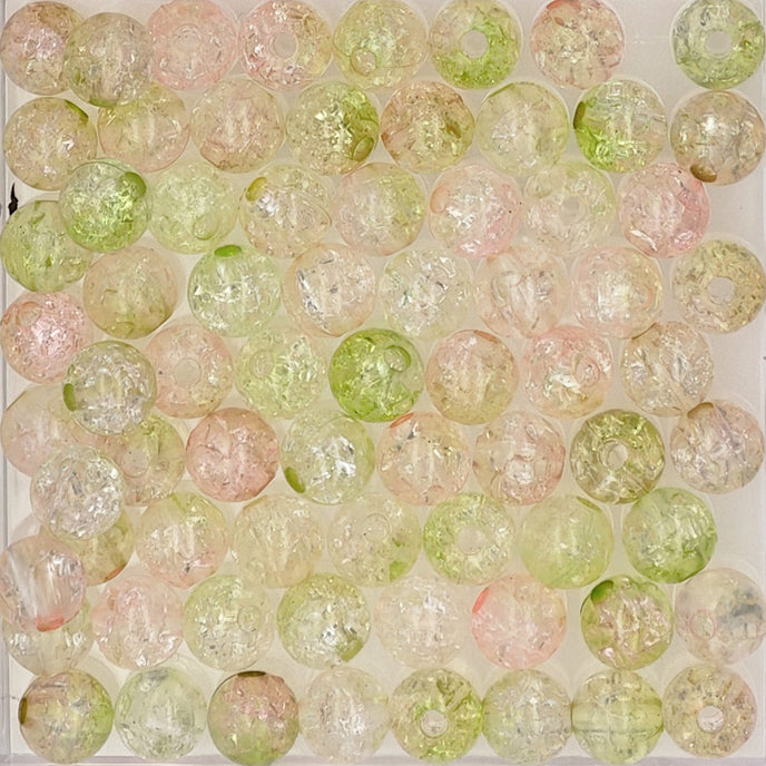 Smooth acrylic beads are packaged in an assorted variety of different colors. Lightweight beads are colorfast.